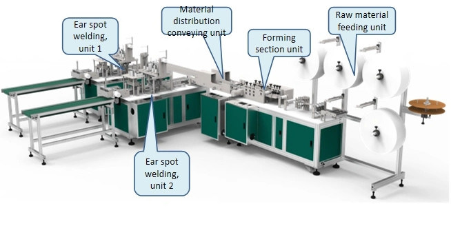 Automatische Fertigungsstraße der Gesichtsmaske-Fertigungsstraße-, alias einer bis dreimaske, bestanden aus einem Band der Maskenkörper-Maschine und drei Ohrs bestanden aus Schweißgerät. Jede Minute kann 90-100-teiliges der kompletten flachen Maske, Maskenspezifikationen ausgeben: 175*95 Millimeter drei Schichten des nichtgewebten planaren Filters schreiben guaze Maske. Verglichen mit der einzelnen unabhängigen Art die Maske, welche die Maschine, verbunden dem automatischen Förderband und dem Verbindungshafen herstellt, verbessern der einzigartige Entwurf zusätzlich zu die Produktions-Leistungsfähigkeit, verringern künstliche Kosten, sind, um die künstliche Teilnahme herabzusetzen und verringern die Risiken einer Maske ist Verschmutzung im Produktionsverfahren.